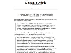 Clean as a whistle is a minimalistic wordpress theme designed to show off your content. It adds focus to your text and images, is easy to use, has a couple of options you can customize and is absolutely free to download and install. After the success of “White as milk“, this theme uses a newer web framework that should make updating and customising these theme a whole lot easier.